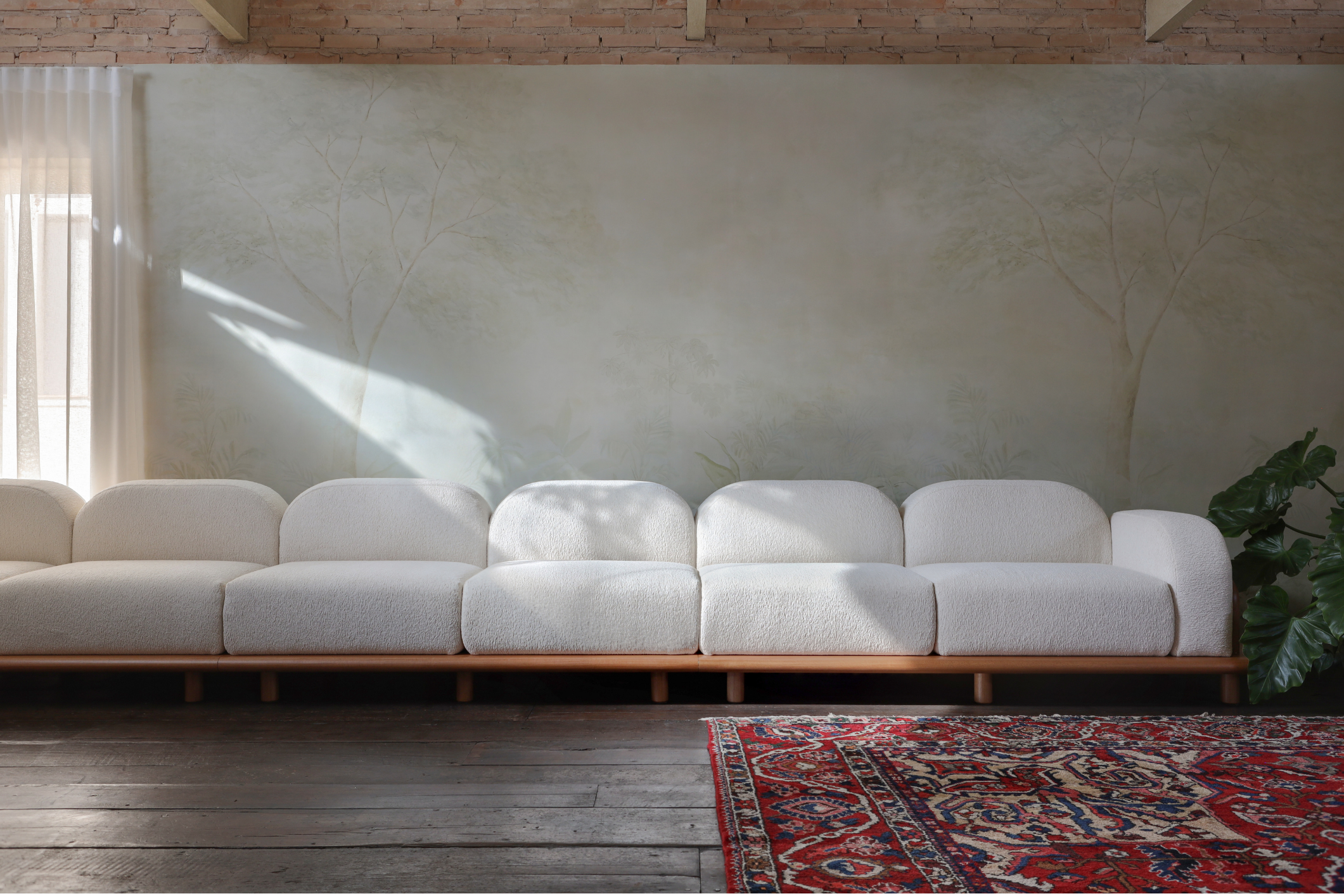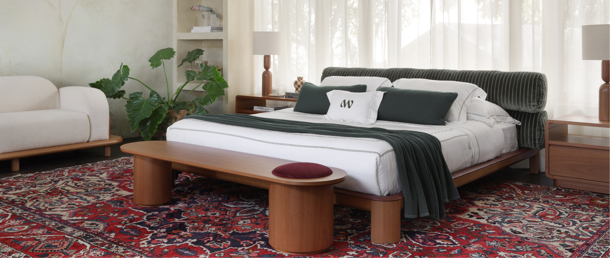 A composição privilegia a horizontalidade e a permanência. No centro, a cama Oca integra o conjunto com desenho contemporâneo e volumes precisos, reforçando a sensação de estabilidade e conforto genuíno.